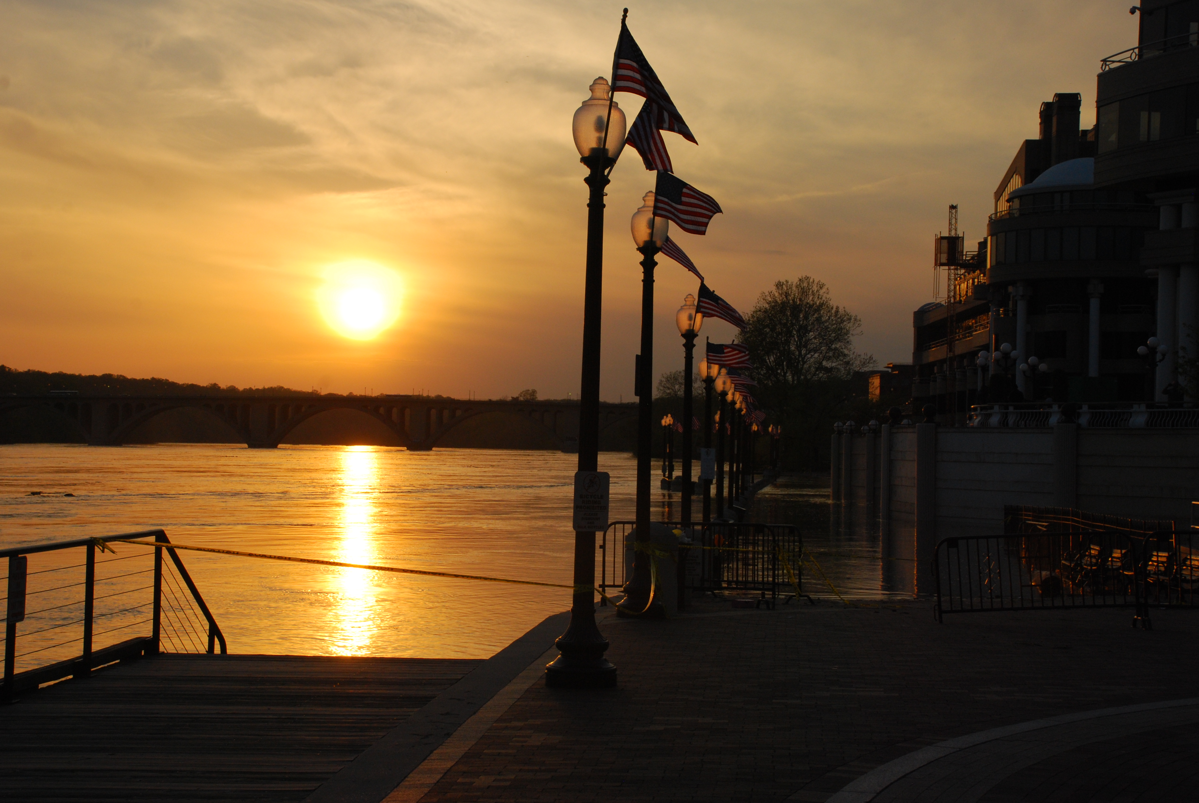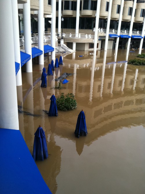 Yesterday, the Georgetown Harbour waterfront suffered a catastrophic flood. The flooding was a result of a 10 foot rise in the river level caused by last weekend’s rains, which made its way down toward the Chesapeake. Ordinarily this amount of flooding would cause the Washington Harbour to raise its flood walls. Yesterday, however, the walls were not up and by 10:00 in the morning, restaurants by the fountain began to get flooded.