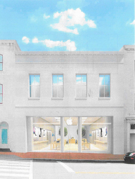 While Vox Populi may have gotten the DCist link love it’s the Georgetown Metropolitan that has the actual approved most recently rejected* designs for the new Apple store at 1229 Wisconsin Ave. Check them out: